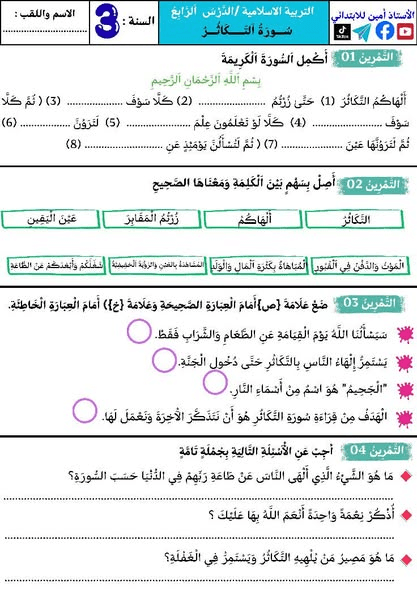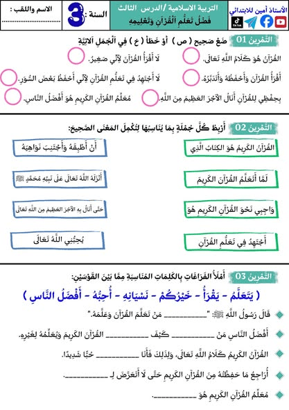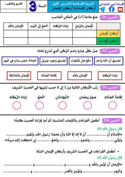 اختبارات شاملة في مادة التربية الإسلامية للسنة الثالثة ابتدائيPost author:oussamaPost published:2025-12-07Post category:تعليم مراجعة شاملة تحضيرا لاختبار الفصل الأول في مادة التربية الإسلامية للسنة الثالثة ابتدائي. من اعداد الأستاذ أمين للابتدائي بارك الله فيه وجزاه خيرا. You Might Also Like مذكرات الأسبوع السادس عشر 16 في جميع المواد2025-01-26 تمارين درس مستقيمات متوازية و مستقيمات متعامدة السنة الثالثة ابتدائي2026-01-07 اختبار الفصل الأول في مادة الرياضيات السنة الثانية ابتدائي2025-12-09