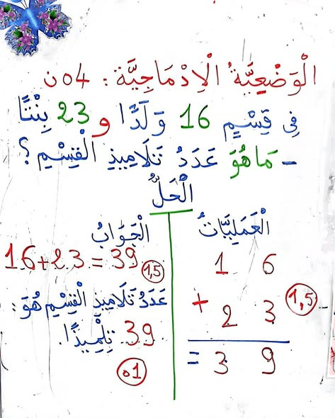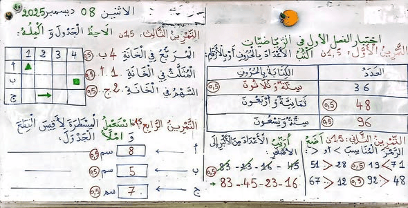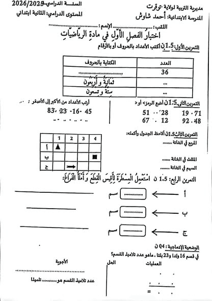 اختبار الفصل الأول في مادة الرياضيات السنة الثانية ابتدائي