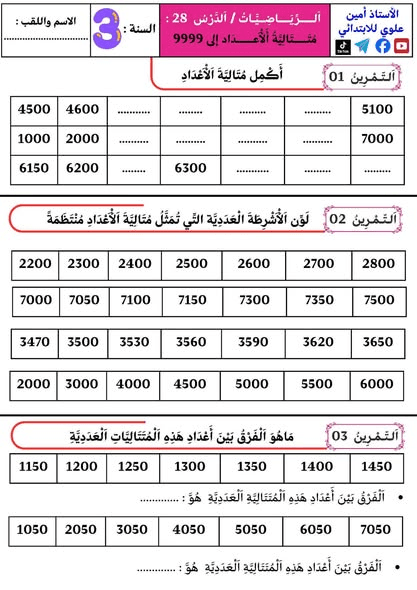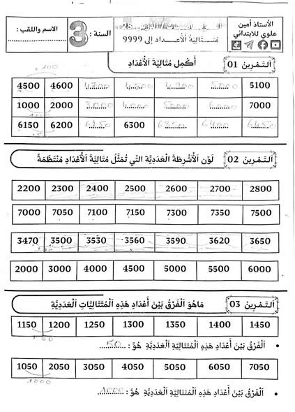 تمارين درس متتالية الأعداد إلى 9999 مع الحل السنة الثالثة ابتدائيPost author:oussamaPost published:2026-01-12Post category:تعليم تمارين درس متتالية الأعداد إلى 9999 مع الحل السنة الثالثة ابتدائي. من إعداد الأستاذ أمين للابتدائي بارك الله فيه وجزاه خيرا. You Might Also Like تمارين دروس الوحدة الثالثة من المقطع الثاني في مادة اللغة العربية السنة الثالثة ابتدائي2025-11-25 ملخص ولا أروع – رياضيات السنة الرابعة متوسط2025-12-18 مخطط بناء التعلّمات لشهر جانفي للسنة الأولى ابتدائي(2025–2026)2026-01-04