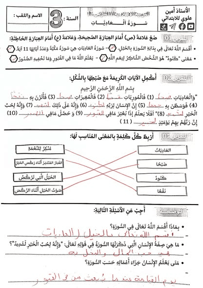 تمارين في مادة التربية الاسلامية حول درس سورة العاديات مع الحلPost author:oussamaPost published:2026-01-12Post category:تعليم تمارين في مادة التربية الاسلامية حول درس سورة العاديات مع الحل. من إعداد الأستاذ أمين للابتدائي بارك الله فيه وجزاه خيرا. You Might Also Like تقويم شامل للفصل الأول مادة الرياضيات السنة الثالثة ابتدائي2025-12-07 استعمل الصيغ (الأمس – اليوم – غدا) + أداة الاستفهام (لماذا) السنة الثانية ابتدائي2025-12-07 تعبير كتابي حول غسل اليدين بالفرنسية سنة أولى متوسط2025-11-16