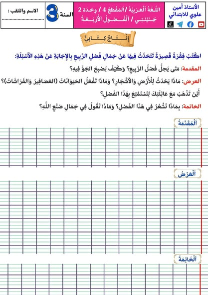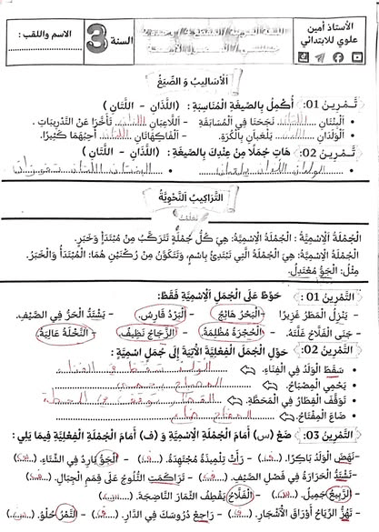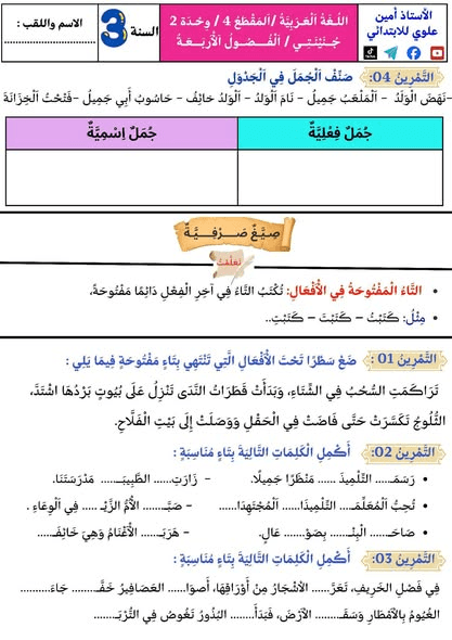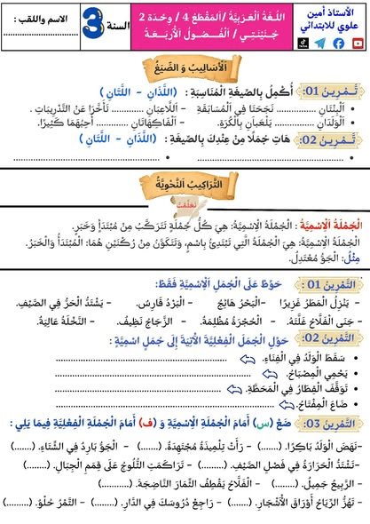 أقوى ملف لدروس اللغة العربية الأسبوع 14. الصيغ – التراكيب النحوية (الجملة الاسمية) – الظواهر الصرفية والاملائية(التاء المفتوحة في الافعال ) – انتاج كتابي حول الفصول الاربعة مع الحل للنمووووذجي. من إعداد الأستاذ أمين للابتدائي بارك الله فيه وجزاه خيرا.